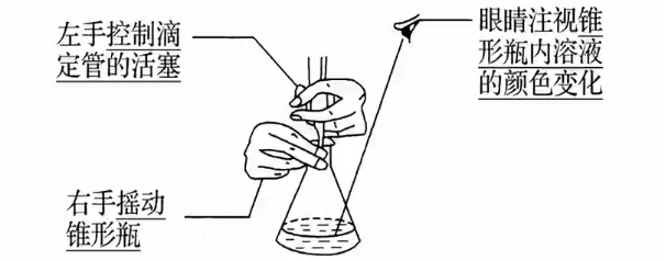 • 在锥形瓶下垫一张白纸,左手控制滴定管,右手摇动锥形瓶,眼睛注视锥形瓶溶液颜色变化。摇动时右手握住锥形瓶颈,使溶液单方向不断旋转(左旋、右旋均可),不可前后振动。